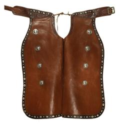 Two-tone brown batwings measuring 37" overall length with Bohlinmade and maker-marked intricately engraved sterling buckle, floral carved tapered billet, 1 3/4" domed sterling Bohlin conchos, Alternating silver diamonds and Bohlin spots on the perimeter. Very good condition, c 1940s