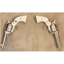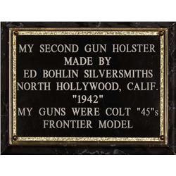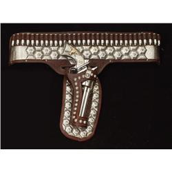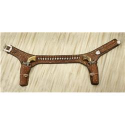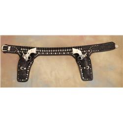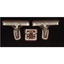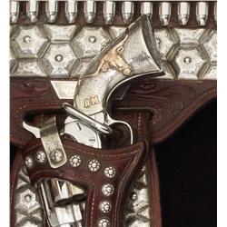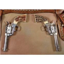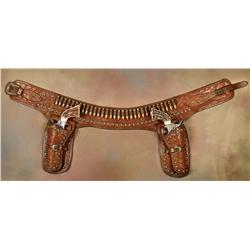 BELT: Edward H Bohlin, Hollywood, California filigreed leather buscadero double-gun rig. Maker-marked and stamped on the back of the belt and both holsters. Gold foil background on the belt, silver background on the holsters, 25 silver bullets in the cartridge loops, perimeter laced, 2 3/4" x 4" engraved sterling buckle with small Bohlinmade maker-mark, half-inch, engraved sterling buckles attach each holster. Measures appx 47" overall and 42" to the middle belt loop. Great condition, c 1950s-60sGUNS: Colt SAA .45 cal, 4 3/4" barrels with aftermarket engraving and stag grips. Ser#160678 (1895), #293932 (1907)