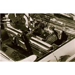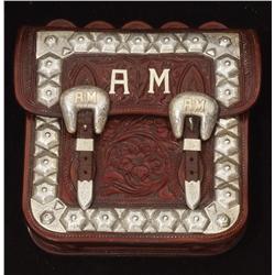 Adorned with sterling hexagon conchos, the floral carved, leather mounted rigs each measure 21" across and include a single skeleton holster with a 5 1/2" colt SA Ser #139175, 283773(?). Each with rose gold longhorns and gold initials AM plus 32 silver bullets. Guns are non-operational. Plaque on each states Designed and Made by Edward H Bohlin, measures 2 1/2" x 1/2". Hung on the back of each front seat; Single saddlebag, 10" square with a pair of 3-piece, half-inch Bohlin-marked buckle sets. Hung on the front console.