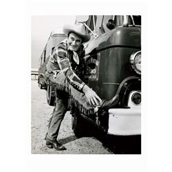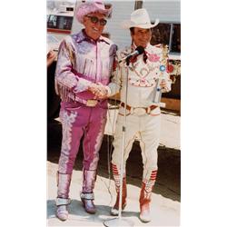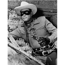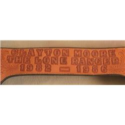 Maker-marked Edward H Bohlin, Burbank & Hollywood silver-mounted double-gun rig with CLAYTON MOORE / THE LONE RANGER / 1982-1986 tooled on the backside. Rig was made expressly for Clayton Moore and worn in numerous special appearances during the 1980s. Rig is identical to the Bohlin gunbelt he wore as the The Lone Ranger. It is mounted with round and square Bohlin conchos separated by Bohlin’s trademark silver spots. The belt is attached via a 1 1/2", 3-piece, engraved, sterling buckle set and the two holsters are secured with 1 1/2" ranger sets. Holsters contain consecutive 4 3/4" .44 special colt SSA Ser #SA34015 and SA#34016 with ivory longhorn grips and colt medallions. Rig includes the Lone Ranger’s trademark silver bullets. Superb condition.