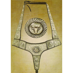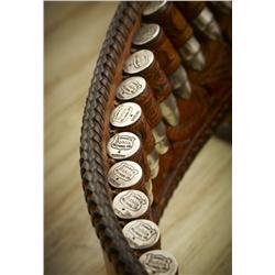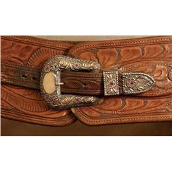 Ed wanted the riders of his saddles to look elegant and match the beauty and artistry of the outfit. He made fine matching vests, chaps, belts, gunbelts, bolos, hatbands, and buckles to dress his riders. The most personal of Bohlin's buckles were made, some by his own hand. He made buckles to honor horses, longhorns, rodeos, ranches and women. He used sterling silver, gold (in 3 colors) rubies, diamonds. He cut the metals to form lacy overlays, and bound the edges to look like rope. Matching gunbelts were made of the same fine leather of the saddles with the same elegant silver spots and engraving. Special gun grips were fastened to Colts and other pistols and shotguns, all sterling silver and gold, with matching buckles.