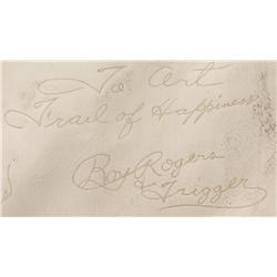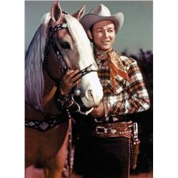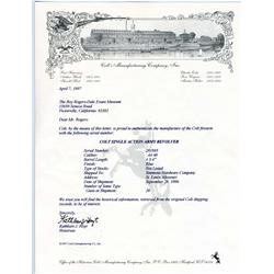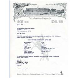 a) Brown Edward H Bohlin, floral carved, double buscadero gun rig, maker-marked with the oval Bohlinmade cartouche on the back of both holsters and the front and rear of the belt. The rig had an unmarked 3-piece 1" sterling and 10K gold, rope-edged, 3-piece ranger set inset with rubies (1 missing) on the buckle keeper and tip. The Bohlin silver spotted holsters have Bohlinmade, 3-piece, half-inch ranger sets; b) Colt SA, 4 3/4" bbl, Ser #41588 with Colt letter to the Roy Rogers / Dale Evans Museum dated 4/7/97 indicating that original .45 cal was shipped 10/18/1877 to Schuyler, Hartlet & Graham in New York. Typical studio plastic stag grips. Re-nickled, diamond & stippled pattern engraving; c) Colt SA .44/40 4 3/4" bbl Ser #281805 with Colt letter to the Roy Rogers / Dale Evans Museum dated 4/7/97 indicating that it was shipped to Simmons Hardware (St. Louis, MO). Standard studio faux stag grips. Heavily polished then re-nickeled, some replaced parts
