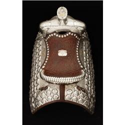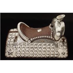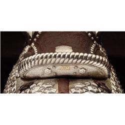 Fabulous floral carved Hexagon pattern Bohlin saddle with a 11 1/2" seat. Maker-marked on seat plate and just below the horn. Gold AM on both sides, silver rope cantle cover, raised Indian head and gold AM on the Pelican style horn, silver star on the corner plates. Saddle, with silver work by Bohlin's Bud Phillips, is a miniaturized version of Art's Hexagon saddle ridden in numerous Rose Parades and other events. Excellent condition. Includes copy of original Bohlin receipt Bud PhillipsBud Phillips accepted an apprenticeship with the Bohlin shop at 5760 Sunset Blvd in the late 1930s, eventually working for the illustrious Hollywood silversmith for nearly five decades. He became one of the masters working in the creation of the Wrigley, Lyndon Johnson and other stellar rigs. As Bohlin's premier engraver, Bud was responsible for fulfilling the exacting standards set by his uncompromising employer. Phillip's later recalled to Bohlin author and expert, James Nottage, that Mr. Bohlin had a real temper wanting things done in only one way - his way. As a similar perfectionist, Art Miller insisted that Phillips work exclusively on the creation of the exquisite Bohlin mounted silver accessories for his custom vehicles and the dazzling results are quite evident.