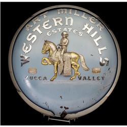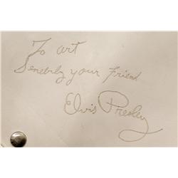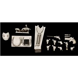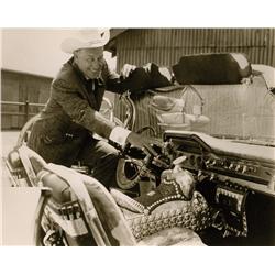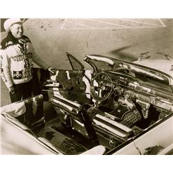 a) 28” round continental kit cover with a three dimensional sterling rider (12” x 11”) atop a Bohlin Hexagon saddle on a brass (?) horse with two Bohlin silver seat plates designed exclusively by Edward H Bohlin; b) Carved leather steering wheel (half) cover; c) Bohlin engraved gas pedal; d) Bohlin engraved brake pedal; e) Frontier model Derringer (Ser #351, non-operational) with silver Bohlin grips and gold initials AM on both sides; f) Bohlin emergency brake cover; g) Three white leather tonneau covers autographed by Elvis Presley (twice) Debbie Reynolds, Guy Madison, Rex Allen Roy Rogers & Trigger, Bob Taylor, Ben Johnson, Tex Williams, Monte Hale, Andy Devine, Audie Murphy, Dale Robertson, and more; h) Misc Chrome auto parts and mountings. Includes copy of original Bohlin receipt