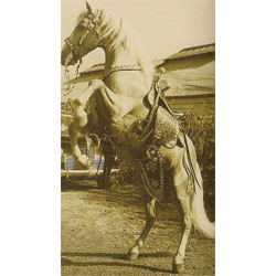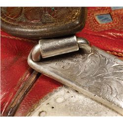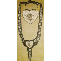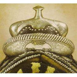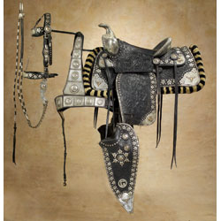 Ed Bohlin was known for his beautifully crafted parade saddles. A perfectionist, for good and bad, he never accepted anything less than the best craftsmanship. The leather on his saddles still squeak after 60 years. The silver requires only a cloth to clean because he used the highest grade of sterling. He and his artisans made many of the pieces by hand, especially the gold figures on his saddles. His carving was stunning and recognizable. Many of High Noon's customers remember going into Bohlin's shop as children while their fathers purchased saddles, buckles, belts, bolos and money clips. Some time the kids got a special gift, too, from their dads. A few child's saddles (The Jackie Cooper model) were made to match their fathers' for parades. The Tim McCoy model and others were made for the stars of the era. Fiesta was truly a work of art, both in the silver and the pictorial carving. The Murietta was one of his brilliant models, mounted with Indian and Tepee design with distant hills all done in three shades of gold. The Dicksons were used many times for riders who wanted to twinkle with silver in parades.