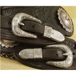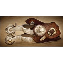 Fully sterling silver overlaid, maker-marked Bohlinmade Hollywood, Calif parade spurs with tapered heelband, swinging buttons, 1 3/4" cookie cutter rowels. impressive two-piece, floral carved leathers with 1 1/2" engraved domed conchos with raised gold initials GFG JR (George F Getz Jr), gold rope edge, sterling and gold 3-piece Bohlinmade and marked buckle sets with rubies. Superb condition, c 1940s. PROVENANCE: George F Getz. Jr, Industrialist and Arizona Rancher, was the son of the founder of the Globe Corporation, which began in Chicago in 1901 as a coal distribution company. Over the decades the company successfully evolved with the changing times and market opportunities, achieving success in manufacturing and later, banking and finance. George Jr was an early member of the illustrious Rancheros Visitadores, joining the renowned Santa Barbara men's riding group in 1939. Getz retired to Scottsdale, Arizona in the early 1970s taking with him a fabulous collection of fire fighting equipment that eventually became the Phoenix Hall of Flame. Continuing his passion for riding, George frequently rode in Scottsdale's annual Parada del Sol Parade, the world's largest Horse Drawn Parade, taking place every February in Arizona.