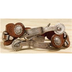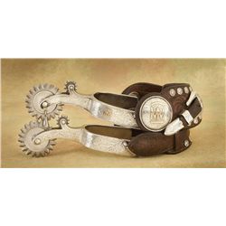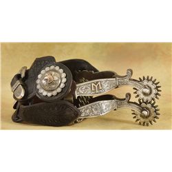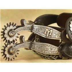 Double-mounted stainless Edward H Bohlin, Hollywood, maker-marked parade spurs featuring Bohlin's trademark double cookie-cutter rowels - the larger measuring 2" in diameter and the smaller on the chap guard measuring 3/4". The heelband has the raised gold MM brand, which is replicated in a larger format on the 1 7/8" domed conchos and again on the 3-piece Bohlinmade buckle sets. Spurs and conchos feature jinglebobs and a twisted silver rope edge. The two-piece Bohlin marked floral carved leathers are attached to swinging buttons and adorned with thirteen Bohlin Pattern No 832 flower silver spots. These spurs were purchased by Montie in the late 1930s and were worn in his movie appearances, hundreds of live performances, over fifty Pasadena Rose Parades and when he roped Dwight Eisenhower at the 1952 Presidential Inaugural. The pair appears in numerous photographs with Montie, and shows evidence of passionate, exclusive personal use