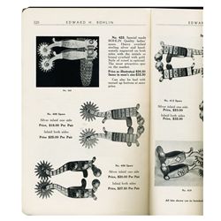 Exact pair of spurs (not just the style) pictured in both the 1930 and 1937 Bohlin catalog as Pattern No 422, this double-mounted exquisitely engraved, silver overlaid late 1920s ladies iron spurs with the 1 1/2" - 20 point rowels enhanced with double scalloped silver washers, were made for Mabel Yorba of the illustrious Yorba family. They feature her initials in raised gold letters on the heelband and have solid nickel heel chains. The two-piece floral carved Bohlin straps have 1 1/2" scalloped conchos with a raised gold horsehead. The three-piece buckle sets appear to be handmade - possibly by Bohlin himself. Humbly described in the Bohlin catalogs as the most attractive spur on the market. Though unmarked because of their very early pre-1930s date, the catalog picture is sufficient evidence to satisfy any skeptic as to their Bohlin origin and they are, arguably, the earliest documentable pair of Bohlin cowgirl/ladies spurs extant