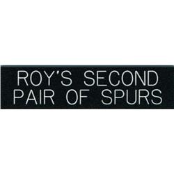 1930s Edward H Bohlin silver overlaid, Hollywood, California, maker-marked stainless steel spurs with a 2 1/2" shanks, 1 3/4" cookie-cutter rowels. Bohlinmade, Hollywood oval football cartouche stamped below the bar affixed to the swinging buttons on the left spur. Right spur made-to-match. Two-piece floral carved, Bohlin marked straps with 1 1/2" scalloped and engraved conchos and 3-piece maker-marked 1/2" engraved sterling buckle sets. Holes drilled on the heelbands for tie downs. Worn extensively by Roy from the early 1940s through the 1950s. Prominently displayed in numerous photos and at the Victorville and Branson RR/DE museums. The brown boots are classic RR custom made with inlaid eagles on the shaft and back quarter and another Eagle on the vamp. Gold inlaid stars cross the top piping with decorative pulls. The boots have a Roy-made 2" slit along the sole, his unique way of breaking in a snug pair of boots -- according to his son, Dusty.